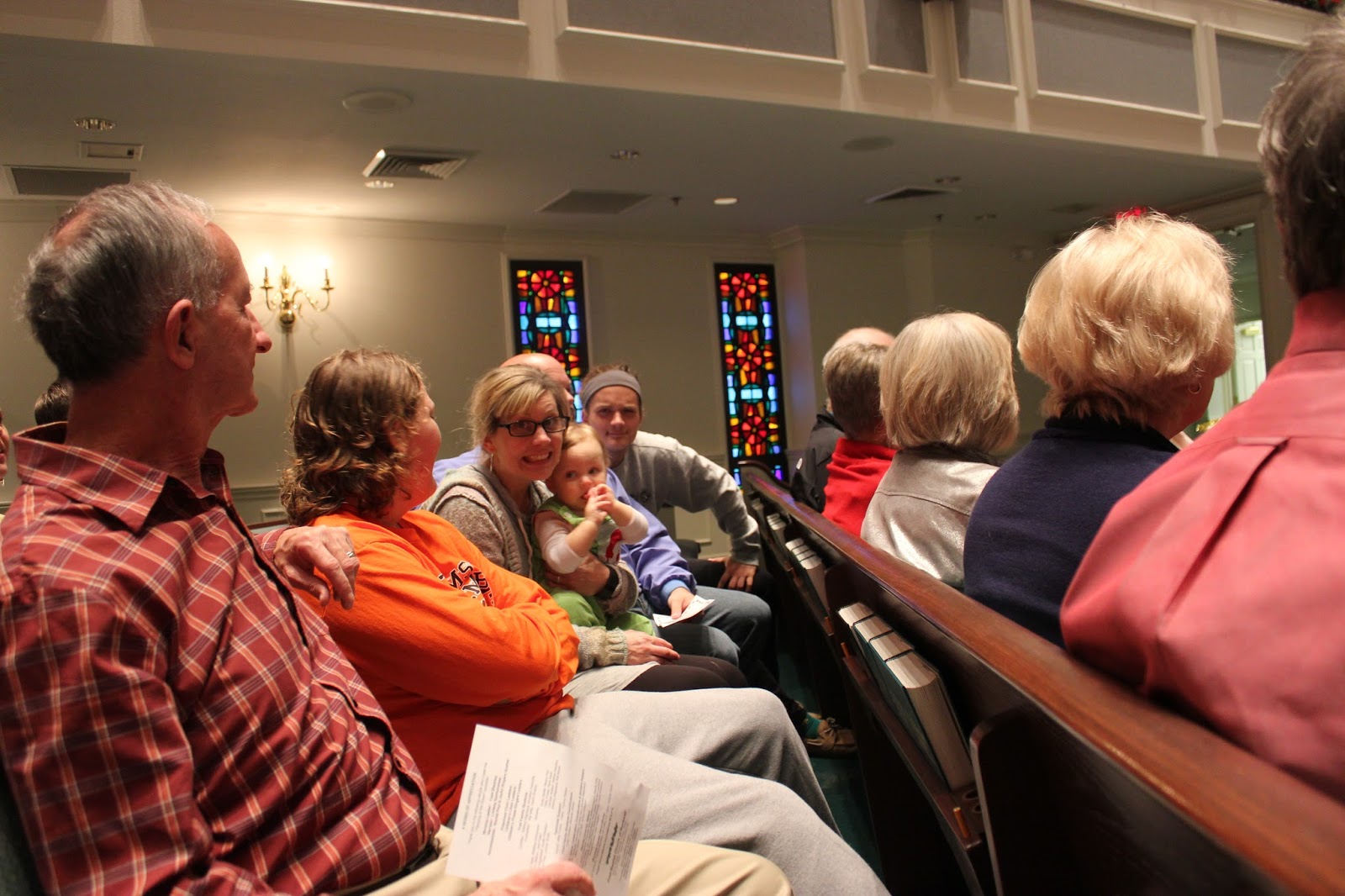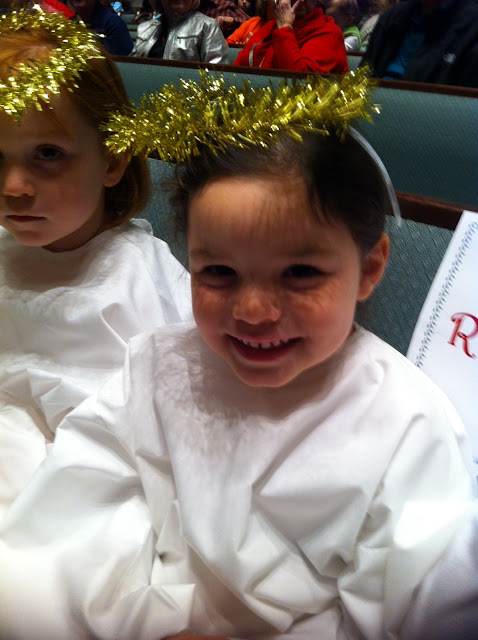 Brian got Mallory all ready and my parents just helped get the costume just right. Here is my angel ready to make her choir debut! The preschool choir were all people from the story of Jesus's birth so Mallory and her friend Katie got to be angels!